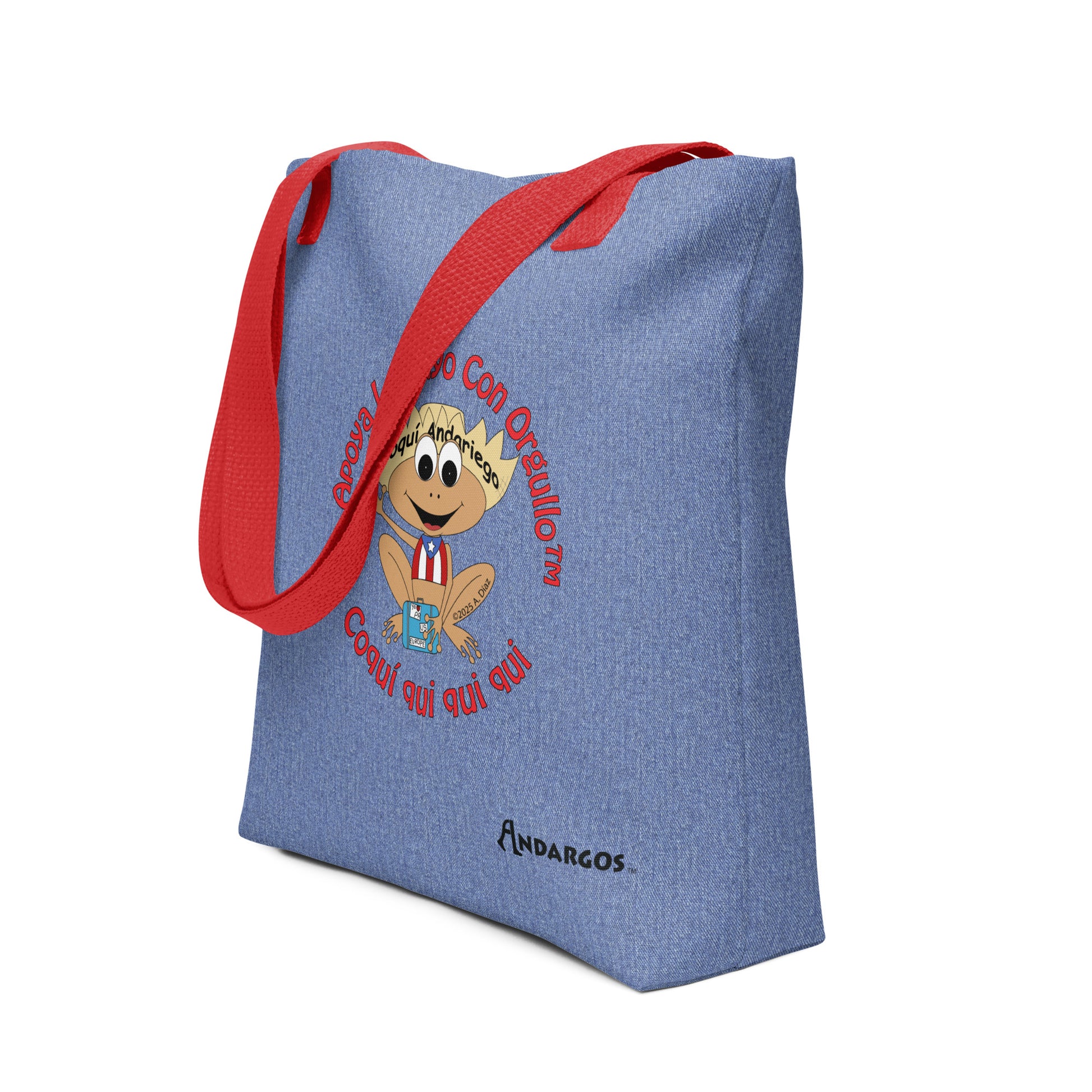 Luce tu orgullo puertorriqueño dondequiera que vayas con la bolsa de tela Andargos Coquí Andariego "Apoya lo Tuyo con Orgullo". Con el entrañable personaje Coquí Andariego y el inspirador lema "Apoya lo Tuyo con Orgullo", esta vibrante bolsa de tela vaquera azul de 15 x 15 es más que una simple bolsa: es una declaración de intenciones.